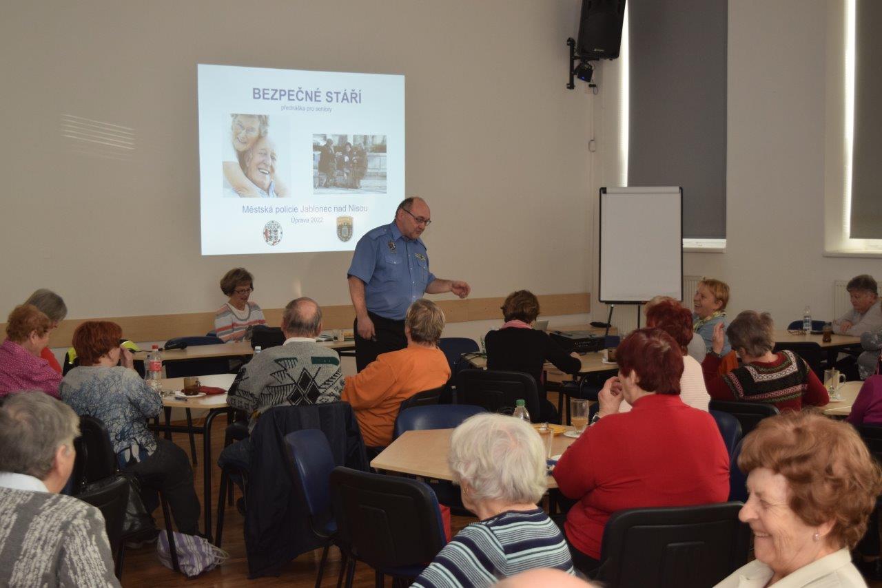 Senioři ČR v Jablonci nad Nisou pořádali své pravidelné setkání ve Spolkovém domě v ulici E. Floriánové a tentokrát si pozvali preventistu městské policie. „Uspořádali jsme přednášku v rámci prevence kriminality, jejímž tématem na rozdíl od minulého setkání, kdy jsme hovořili o BESIP a dopravě, bylo bezpečné chování seniorů,“ přibližuje Miloslav Lejsek z oddělení prevence kriminality Městské policie Jablonec nad Nisou.